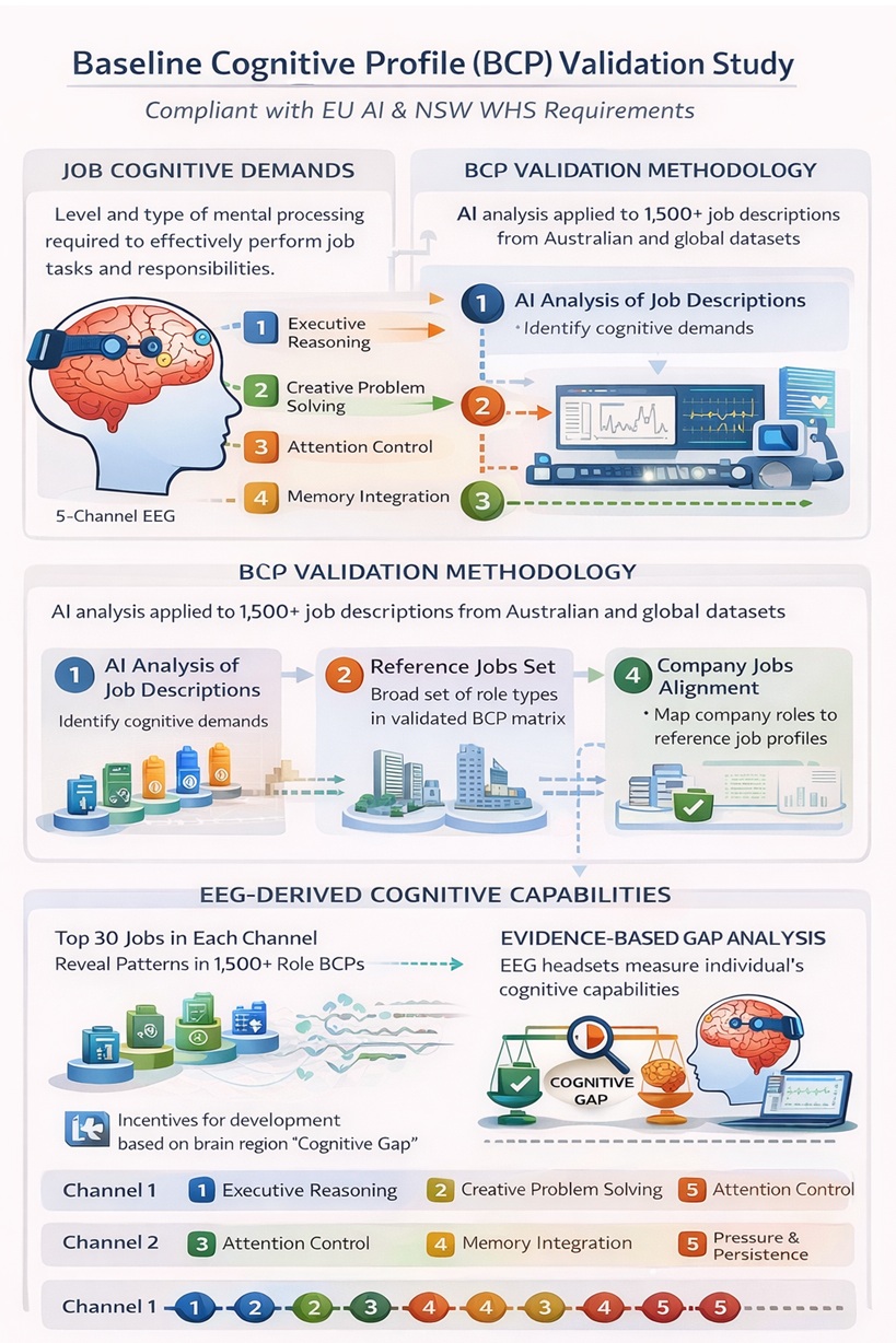 The BCP Validation Study focuses on five key brain regions, monitored through a 5-channel EEG classification system, selected for their relevance to these cognitive functions. To establish baseline profiles for these regions, AI inference was applied to a rich set of job descriptions sourced from Australian and international occupational datasets. This enabled the identification of hypothetical neural activation patterns and frequency ranges corresponding to each role’s cognitive requirements