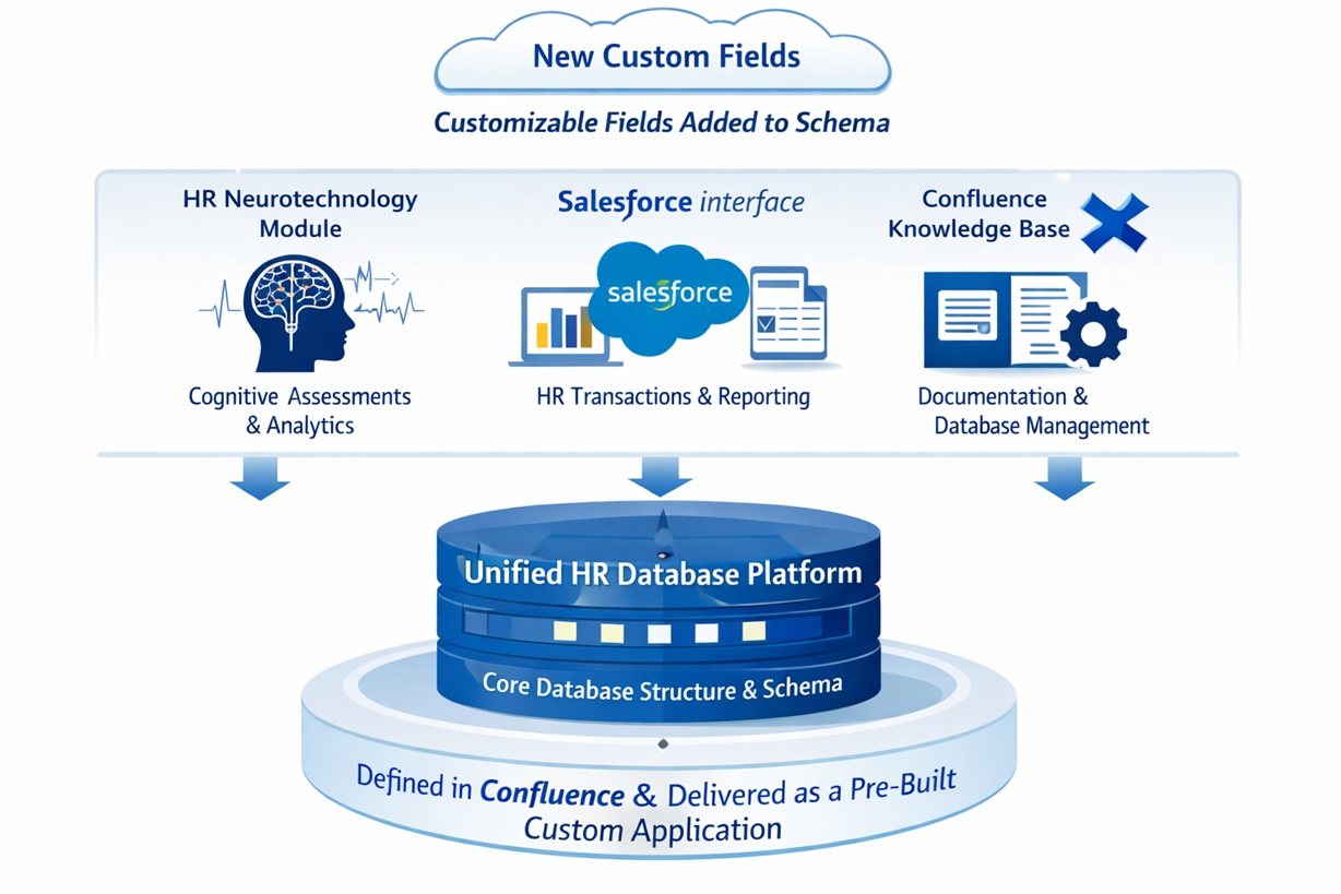 CET’s BCP Validation Study is underpinned by a purpose-built data architecture designed to treat employee neurodata as highly sensitive, regulated information while still enabling its strategic and ethical use. At the core sits a secure Unified HR Database that separates personally identifiable information from neurocognitive metrics through structured data partitioning, encryption at rest and in transit, and strict role-based access controls. The front-end ecosystem - comprising the Confluence Knowledge Base (for AI rationale, governance traceability and controlled knowledge sharing), the Salesforce transaction and business data repository, and the HR neurotechnology module - operates through permissioned integration rather than unrestricted data exposure